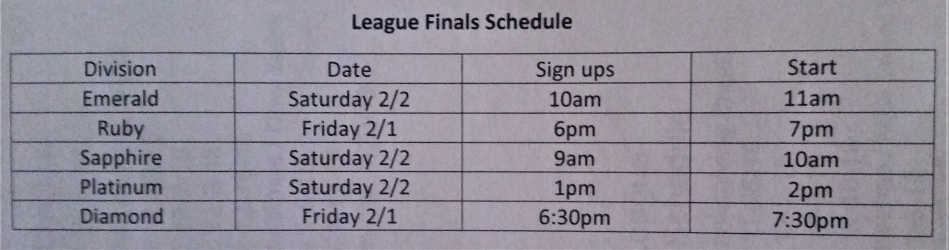 This Schedule is made in advance for the players to have knowledge of when their divisional league finals is taking place. This advance notice is produced just for the league players so they can make the necessary arrangements so they are available to attend their divisional finals. Even if a S.D.L. team does not make the cut after playoffs all teams will have an opportunity to buy back in the Divisional Finals for a chance to win some of the big cash!